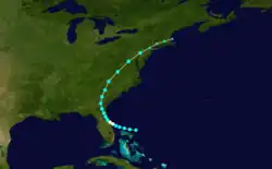 Ahead of the hurricane's landfall, storm warnings were issued by the Weather Bureau from Jacksonville, Florida, to Fort Monroe, Virginia, and were later extended north to Boston, Massachusetts, once the storm began progressing along the U.S. East Coast.[7] At landfall, the strongest winds occurred east of the Suwannee River, reaching 45 mph (72 km/h) in Jacksonville. Bridges, highways, and railways were damaged by the hurricane, and some buildings were toppled.[2] The Florida East Coast Railway between Titusville and Miami was significantly damaged.[8] The system also dropped heavy rainfall across portions of Florida, with a maximum of 16.61 inches (422 mm) recorded at St. Petersburg.[9] Combined with the strong winds, the rain caused severe damage to crops. The damage toll was estimated to be at least $250,000. Gusty winds accompanied the storm along coastal regions of the northeastern United States, including a 53 mph (85 km/h) wind recorded in New York City.[2] The remnants of this storm brought rainfall to Ontario, causing heavy crop losses, including 40 percent of grain in Scarborough. Five deaths occurred when an automobile slid off a bridge in Utterson.[10]
