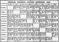 The Federal League had its Opening Day on April 10, featuring all eight teams.[3] Opening Day for the American and National Leagues was on April 14, featuring the 16 teams of those two leagues,[4] as had been scheduled the season prior. The Federal League had the final day of its regular season on October 3.[5] The final day of the regular season for the National and American Leagues was October 7.[6] The World Series took place between October 8 and October 13.[7]