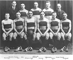 The 1919–20 Fighting Illini men's basketball season was the final of eight seasons for head coach Ralph Jones. This group was slightly better than the previous as they bounced back from the first losing season of Jones' career and finished third in the Big Ten. The campaign began with a six-game home winning streak; however, over the next seven games, the team posted only three wins, while losing four. After Jones left Illinois, he went to Lake Forest Academy in Lake Forest, Illinois. He coached both basketball and football at the academy for 10 years. His football team won 76 games and lost six in his ten years. His basketball teams had a ten-year record of 94 wins and 9 losses.[1] The record the Illini had at the conclusion of the 1919–20 season was nine wins and four losses overall with an eight-win, four-loss conference mark. The starting lineup included captain K. L. Wilson, J. B. Felmley, Julian Mee and P. C. Taylor rotating at the forward positions, All-American Chuck Carney at center, and Charles Vail, Burt Ingwersen, and Laurie Walquist as guards.[2]