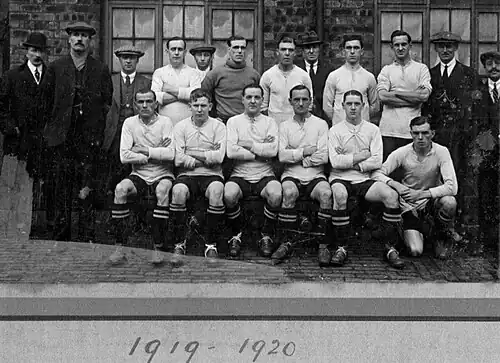 Back in the Second Division, the club faced a battle to register their players in time for the nine-hour trip to South Shields, where they lost 2–0.[1] Two defeats to eventual champions Tottenham Hotspur followed, before the club scored their first goal, and picked up their first win against South Shields on 10 November thanks to an Aaron Lockett strike.[1] The club signed Bobby Blood from Leek United for £50 to bolster their strike force. The player had one leg shorter than the other and was riddled with bullets from his valiant efforts in the First World War. Yet, he would still prove the doctors wrong who said he would never play football again.[1] The win against South Shields initiated a run of three wins in five games. It was around this time that chairman Frank Huntbach instilled the club with the official nickname of "The Valiants". However, this was followed by a streak of seven games without victory.[1]