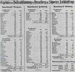 The referendum was held on May 11 and showed that 80.7% of voters and a majority in 93 out of 96 municipalities voting in favor. The only municipalities with a majority opposing the proposal were Bludenz, Bolgendach and Hittisau.[3] The exact numbers for the referendum have been contradicted by several sources due to errors in the transmission of results from several municipalities, leading to manual corrections of previously printed announcements. According to Ulrich Nachbaur, head of the Vorarlberg State Archives, the final count was 48,302 yes and 11,552 no.[1]