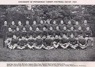 The 1920 Pittsburgh Panthers football team was an American football team that represented the University of Pittsburgh as an independent during the 1920 college football season. In its sixth season under head coach Pop Warner, the team compiled a 6–0–2 record and outscored all opponents by a total of 146 to 44.[1][2] The team played its home games at Forbes Field in Pittsburgh. "Perhaps due to the resurrection of sports after the war period, Pitt enjoyed an athletic year that was quite indicative of its pre-war strength, which so practically dominated college sport activities in this section for many years. The season of 1920-21 boasted of representative Pitt teams in every branch of sport - football, basketball, baseball, track, swimming and tennis. Aviation, which made its initial bow at the University last year, progressed in fine manner – the team having been entered in the big intercollegiate meet.[3]