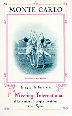 The 1921 Women's Olympiad Olympiades Féminines and Jeux Olympiques Féminins[2] was the first international women's sports event, a 5-day multi-sport event organised by Alice Milliat and held on 24–31 March[3] 1921 in Monte Carlo[4] at the International Sporting Club of Monaco.[5] The tournament was formally called 1er Meeting International d'Education Physique Féminine de Sports Athlétiques.[6] It was the first of three Women's Olympiads or "Monte Carlo Games" held annually at the venue, and the forerunner of the quadrennial Women's World Games, organised in 1922–34 by the International Women's Sports Federation founded by Milliat later in 1921.[7]