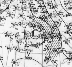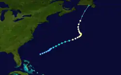 Around August 31, a low-pressure area formed along the tail end of a cold front extending from the Bahamas to Bermuda.[4] Early on the following day, a tropical depression developed roughly 510 mi (820 km) east-southeast of Jacksonville, Florida.[2] The depression moved slowly east-northeastward as the cold front dissipated.[4][2] Late on September 3, the system intensified into a tropical storm, and the next day the cyclone passed northwest of Bermuda.[2] Based on observations from the S.S. Evergreen City, the small storm likely reached Category 1 hurricane intensity early on September 5.[4] The cyclone continued to strengthen, reaching Category 2 intensity on September 6 while drifting northward and then peaking with maximum sustained winds of 105 mph (165 km/h) early the following day. On September 8, the system curved northwestward and weakened to a Category 1 hurricane. The storm then turned north-northeastward on September 9 and transitioned into an extratropical cyclone later that day. The extratropical low continued north-northeastward until dissipating over southern Newfoundland on September 10.[2] Cape Race observed sustained winds of 29 mph (47 km/h).[4]
