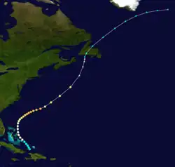 Late on September 24, a tropical wave developed into a tropical storm near Great Inagua Island in the Bahamas.[4] Moving northwestward, the storm gradually intensified and crossed Acklins early the next day. Around 00:00 UTC on September 26, the system intensified into a Category 1 hurricane near Rum Cay. Several hours later, the hurricane turned northward and passed east of the northern Bahamian islands. The cyclone curved east-northeastward early on September 28, around the time that it strengthened into a Category 2 hurricane. Reaching major hurricane intensity early on the following day, the storm peaked as a Category 3 hurricane with winds of 120 mph (195 km/h). The system began weakening by September 30, falling to Category 2 status while passing northwest of Bermuda. Thereafter, the hurricane accelerated northeastward and lost tropical characteristics, transitioning into an extratropical cyclone roughly 155 mi (250 km) south-southeast of Sable Island on October 1. The extratropical system continued northward and struck Newfoundland late on October 2, before resuming a northeastward motion and dissipating near Greenland on October 4.[2]