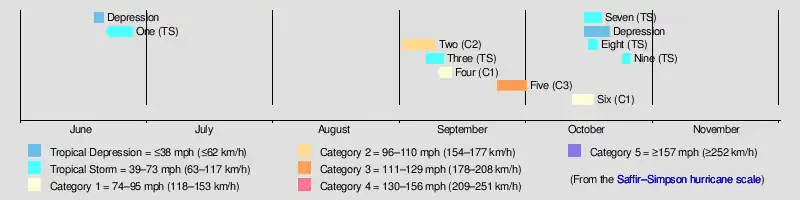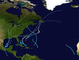 The 1923 Atlantic hurricane season featured 11 tropical cyclones, 9 of which intensified into tropical storms, the most since 1916. Four of the tropical storms intensified into hurricanes, one of which reached major hurricane intensity—Category 3 or higher on the modern-day Saffir–Simpson hurricane wind scale.[1] No tropical storms or hurricanes formed in or entered the Caribbean Sea.[2] The first known system, a tropical depression, formed on June 19, while the last known system, a tropical storm, transitioned into an extratropical cyclone on October 26. Additionally, an October tropical depression was previously recognized as a tropical storm until reanalysis in 2009, while the first and third tropical storms were added to the Atlantic hurricane database that year. The sixth, seven, and eight storms as well as the October tropical depression existed simultaneously on October 16.