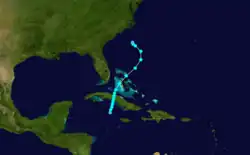 A weak low pressure area developed into the seventh storm of the season formed near the Cayman Islands on October 30.[4][5] Initially a tropical depression, it tracked slowly north-northeastward and reached tropical storm status about six hours after forming. Early on October 31, the storm peaked with maximum sustained winds of 45 mph (75 km/h), several hours before making landfall in Sancti Spíritus Province several hours later. After emerging over the Bahamas, the storm slowly weakened. Late on November 1, the system struck Andros Island with winds of 40 mph (65 km/h). Thereafter, the cyclone accelerated and continued weakening, falling to tropical depression intensity late on November 3. Shortly thereafter, it transitioned into an extratropical cyclone while located about 215 mi (345 km) south of Cape Hatteras, North Carolina.[5]