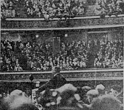 Supporters of both Thompson and Dever resorted to bigotry.[52] Some Republicans used anti-Catholic rhetoric against Dever.[52] Despite Dever also having had a positive relation with black residents of the city,[58] some Democrats attempted to take advantage of Thompson's particularly positive relation with the city's African-American community in order to divide voters racially,[59] claiming that Thompson's election would lead to "Negro supremacy".[52] Palm cards were circulated with an image of Thompson kissing a black boy and with the reverse side reading "Thompson—Me Africa First".[60] Some Democrats hired black people to canvass white neighborhoods for Thompson in an effort to scare white voters.[60] They also attempted to lure black Thompson voters downtown, where they did not often go, with a fake rally outside of Thompson's campaign headquarters.[60] Additionally, the song "Bye Bye Blackbird" was sung at some Dever rallies. Dever supporters also mocked Thompson and his supporters by having a Black man dress up as Paul Revere ride on horseback through the Chicago Loop shouting "The British are coming."[61] Supporters of each candidate accused the other's supporters of plotting to use underhanded tactics to steal the election.[52] In the closing day of the campaign, Dever and Thompson accused each other of attempting to incite a race riot among the city's Black populace.[62]