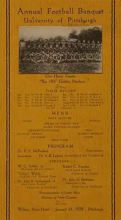 - ^ "Pitt Panthers Squad". University of Pittsburgh Football Official Souvenir Program. University of Pittsburgh Athletic Department. October 8, 1927. p. 17.