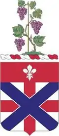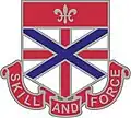 The unit insignia is a Silver color metal and enamel device 1+18 inches (2.9 cm) in height, consisting of a shield emblazoned with an argent, a cross Gules, overall a saltire Azure, that portion of the saltire upon the cross fimbriated of the field; on a chief of the second, a fleur-de-lis of the first. Attached below the shield is a red scroll inscribed "Skill and Force" in Silver letters.