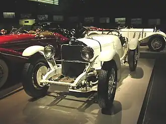 The first German car to run at Le Mans was a privateer entry. Mercedes and Benz had merged in 1926 and had considerable racing success, but with the Depression the company closed its works racing team. Team manager Alfred Neubauer, however, convinced the board to bankroll a privateer team. This was run by their top works driver Rudolf “Rudi” Caracciola. The SSK (Super Sports Kurz) was designed by Ferdinand Porsche as a development of the SS model. The giant 170 bhp 7.1-litre engine could be augmented by a Roots supercharger to put out 300 bhp.[8] However, unlike the Bentleys, the supercharger was not designed to be run all the time (not least for reasons of chronic fuel consumption), and the team was able to convince the ACO to discount the 1.3 supercharger modifier when dictating the car's target distance.[8] Caracciola's co-driver was also from the Mercedes-Benz works team, Christian Werner.