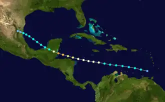 The hurricane began as a tropical wave—a westbound low-pressure area—first observed southeast of Cape Verde on 29 August.[1] Traversing the tropical Atlantic, the wave retained a minimum barometric pressure of about 1010 mbar (hPa; 29.83 inHg) and strengthened briefly the following day.[2][3] By 1 September, however, the wave had become rather weak and indiscernible; it would remain as such for much of its early existence until 6 September, by which time it had moved past the Windward Islands. In this region the system became sufficiently organised to be classified as a tropical depression at 18:00 UTC that same day near Grenada.[4][5] Some six hours after its inception the depression strengthened to a tropical storm over the eastern Caribbean Sea. Owing to a lack of ship observations, data on the storm were scarce in that region. The first ship to identify the storm clearly was the tanker Geo H. Jones, which recorded strong winds in conjunction with rapidly decreasing barometric pressures late on 7 September.[4] As the storm remained west-northwest bound across the Caribbean,[5] more ships were able to record data on the cyclone.[2]