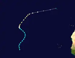 A tropical depression was first identified on October 8 about 575 mi (925 km) northeast of the Virgin Islands and quickly intensified to a tropical storm. Moving towards the west and then northwest, the storm intensified to its peak intensity of 60 mph (97 km/h) at 1800 UTC on October 10 as it neared Bermuda.[3] The island reported sustained wind speeds up to 40 mph (64 km/h).[2] The storm weakened as it progressed farther northward and curved toward the northeast, before transitioning into an extratropical cyclone by 0600 UTC on October 12 approximately 205 mi (330 km) southeast of Sable Island.[3] The system was absorbed by a strong cold frontal boundary later that day.[2]