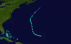 On September 16, a tropical storm with winds of 40 mph (64 km/h) developed out of a frontal boundary about 860 mi (1,385 km) southwest of the northwesternmost islands of the Azores.[2][3] Moving slowly towards the northwest,[3] gales were reported by ships in the region as the cyclone slowly intensified.[2] On September 20, the storm began to move towards the southwest. The system reached peak intensity on September 21, with winds of 65 mph (105 km/h), before transitioning into an extratropical cyclone about halfway between Bermuda and Nova Scotia as it recurved northwards on September 23. The extratropical cyclone later made landfall on Nova Scotia the following day, before dissipating over southern Greenland on September 26.[3] Sustained winds in Atlantic Canada peaked at 29 mph (47 km/h) on Resolution Island in Nunavut.[2]