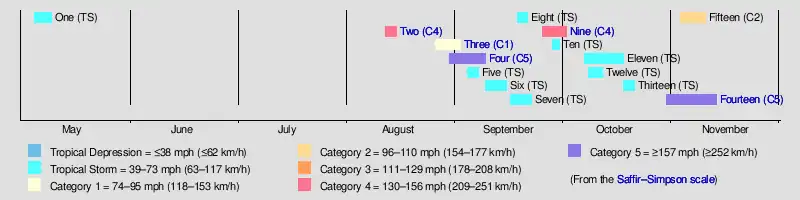 Fourteen October 30 – November 13 Category 5 hurricane 175 (280) ≤915 Leeward Islands, Venezuela, Colombia, Jamaica, Cayman Islands, Cuba, the Bahamas, Bermuda $44 million >3,144 [42][43][44][48]