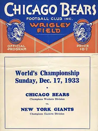 The 1933 NFL Championship Play-off Game was the first scheduled championship game of the National Football League (NFL) since its founding in 1920. It was played on December 17 at Wrigley Field in Chicago,[1][2] and the attendance was estimated at 25,000.[3][4]