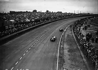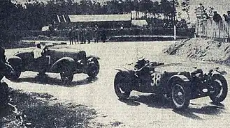 During practice, a stone punctured the fuel tank of Labric's Bugatti. After repairs they fitted wooden slats on the floor to stop it re-occurring during the race.[10] The most serious incident during the lead-up happened in the last practice on Friday night. De Valence in one of the big Bugattis had his lead mechanic with him when he lost control coming out of the first corner. Cutting the corner, the car then slammed into the outside fence ripping off the front axle, throwing the two onto the track. George Delaroche, in his Riley, had just been overtaken but managed to stop without hitting the unconscious mechanic. Taken to hospital, he was in a coma for 9 days before eventually recovering. The car was a write-off and would not take the start.[10][21] The weather had been poor through the week. But this boded well for the heavier British cars, negating some of the power of the dominant Alfa Romeos.[27]