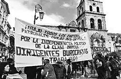 Measures enacted by the government amounted to the "single exchange decree" which devalued the Boliviano and served only to exacerbate the situation. Finally, the FOT, led by labor activist Waldo Álvarez, sent an ultimatum to the government demanding free importation of basic necessities, the 100% increase in wages, the reduction of rent, the prohibition of work night, the suspension of the state of siege, guarantees for freedom of assembly, association, press and union organization, home for the maimed and disabled of war, and work for ex-combatants.[4]