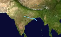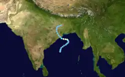 On June 10, an area of unsettled weather was first over the northern Bay of Bengal. Developing into a cyclonic circulation a few hours later, on June 11, this disturbance developed into a depression.[26] As it tracked northwest towards India,[27] it intensified into a deep depression a few hours later.[28] As a result, prior to making landfall southeast of Balasore,[28] it peaked as a minimal cyclonic storm early on June 13 with peak winds of 40 mph (65 km/h).[27] However, once inland, it rapidly weakened, becoming a depression by June 14.[28] The weakening depression would persist northwestwards, dissipating over Westcentral India on June 17.[28]
