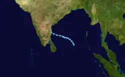 On October 25, due to the northeast monsoon establishing itself, a cyclonic circulation developed in the southern Bay of Bengal.[47] Developing into a depression later that day, the cyclone would develop into a cyclonic storm as it tracked north-northwestwardly.[15] Soon after, it peaked with sustained winds of 50 mph (85 km/h) on October 27.[48] Tracking northwestwardly for a while, it later made landfall near Machilipatnam on 06:00 UTC the next day.[15][48] Weakening soon after, it became a deep depression over Hyderabad, finally dissipating over the Central Provinces on October 31.[15]