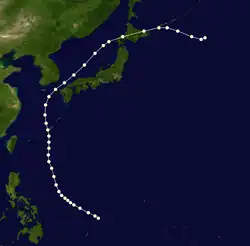 On October 12, a depression formed northeast of Guam, which intensified into a typhoon as it west-northwestward. On October 15, a nearby ship recorded a minimum pressure of 989 mbar (29.20 inHg). On October 16, the trajectory turned to the northeast toward the Ryukyu Islands. Two days later, the typhoon recurved and accelerated northeastward, passing 60 mi (95 km) southeast of Okinawa. After passing southeast of Japan, the typhoon was last observed on October 21.[26][29][32]