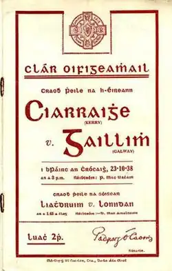 2. ^ Kenny, Tom (14 April 2011). "The men who first brought Sam to Galway". Galway Advertiser. Retrieved 14 April 2011. Bobby Beggs was on the defeated Dublin team [in 1934] but in 1938 he was on the Galway team that triumphed by beating Kerry by 2 – 4 to 0 – 7.
