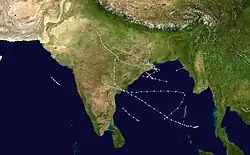 - August 14–19, 1944 – A land depression formed over Jharkhand, moved across India to enter the Arabian near South Gujarat coast. Intensified into cyclonic storm on August 18 before weakening the next day over the Arabian Sea.[10][11]
