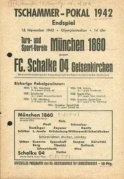 The 1942 Tschammerpokal final decided the winner of the 1942 Tschammerpokal, the 8th season of Germany's knockout football cup competition. It was played on 15 November 1942 at the Olympiastadion in Berlin.[2] A total of 80,000 spectators watched the match, making it the highest attended German cup final in history. This would be the last Pokal final to take place at the stadium until 1985. 1860 Munich won the match 2–0 against Schalke 04, to claim their 1st cup title.