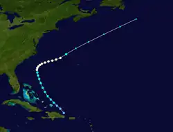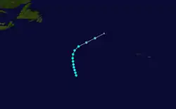 The ninth storm of the season formed early on September 21, via a tropical wave that departed the western coast of Africa several days prior.[2][10] The cyclone only slowly organized as it tracked west-northwest and then north, attaining hurricane strength early on September 24. After reaching its peak as a Category 2 hurricane with maximum sustained winds of 100 mph (160 km/h) around 12:00 UTC the next day, an approaching cold front prompted the beginning of extratropical transition. The hurricane became extratropical on September 26, well south of Newfoundland. The post-tropical cyclone curved northeast over the far northern Atlantic and was last noted south of Iceland two days later.[2]