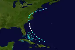 A tropical wave organized into a tropical storm about 135 mi (217 km) east of Cockburn Town in the Turks and Caicos Islands around 12:00 UTC on July 30.[6] The newly formed system intensified on a west-northwest course parallel to the Bahamas, attaining hurricane strength by 00:00 UTC on August 1. From there, it curved toward the north before making landfall on Oak Island, North Carolina, with peak winds of 80 mph (130 km/h) at 23:00 UTC. The system weakened as it progressed through the Mid-Atlantic and into the northwestern Atlantic, and it was last considered a tropical depression around 06:00 UTC on August 4 about 105 mi (169 km) east of Nantucket.[2]