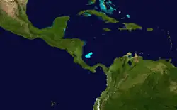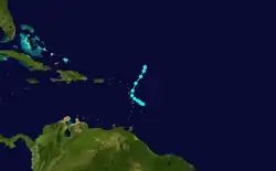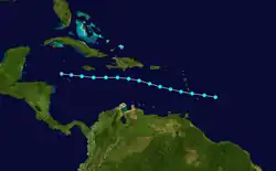 A tropical wave organized into a tropical storm east of Barbados around 06:00 UTC on July 24, although it is possible the system existed farther east in the absence of widespread observations. The system passed near Martinique,[2] where Fort-de-France recorded sustained winds up to 55 mph (89 km/h).[6] Several islands of the Lesser Antilles recorded rainfall, including a peak total of 7.2 in (183 mm) on Saint Lucia.[11] The cyclone then continued on a west-northwest course through the Caribbean Sea. Though it was initially believed the storm struck Haiti, where considerable damage was reported along the coastline near Port-au-Prince, and ultimately deteriorated, modern reanalysis suggests the cyclone continued south of the island. The system was then intercepted by strong wind shear that led to its dissipation west-southwest of Jamaica by 18:00 UTC on July 27. Its remnants continued westward and were last reported north of Honduras the following day.[2][10]