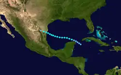 A tropical wave led to the formation of another tropical storm over the northwestern Caribbean Sea around 06:00 UTC on September 19.[6] It moved northwest after formation while steadily intensifying, attaining hurricane strength by 00:00 UTC the next day. The storm moved ashore near Cancún, Quintana Roo, with winds of 80 mph (130 km/h). After moving inland, the cyclone weakened to a tropical storm and curved southwestward. After emerging into the Bay of Campeche early on September 21, it re-attained peak winds of 80 mph (130 km/h) and made a second landfall near Paraíso, Tabasco. The cyclone turned south over the mountainous terrain of Mexico,[10] dissipating after 12:00 UTC on September 22.[2]