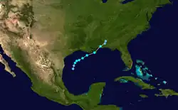 On September 8, a weak area of low pressure developed along the tail-end of a stationary front across the northern Gulf of Mexico.[10] It quickly organized into a tropical depression by 00:00 UTC the next day, positioned about 170 mi (270 km) southeast of Matamoros, Tamaulipas, and further attained tropical storm intensity twelve hours later. The fledgling system moved north and then northeast, making its first landfall along the Mississippi River Delta with peak winds of 65 mph (105 km/h) around 19:00 UTC on September 10. The system made its second landfall along Dauphin Island, Alabama, at 23:00 UTC at a slightly reduced intensity. It dissipated by 12:00 UTC on September 11 and was last documented about 40 mi (64 km) southwest of Montgomery, Alabama.[2]