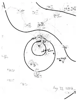 A tropical wave was noted near Grenada on July 11;[6] it organized into the season's first tropical depression two days later around 06:00 UTC while situated near Navidad Bank in the Turks and Caicos Islands.[2] Upon designation, the Weather Bureau planned reconnaissance flights for the first time ever to fly into a newly formed cyclone.[6] It intensified as it moved northwest, attaining tropical storm intensity by 00:00 UTC on July 14 and further strengthening into the season's first hurricane around 06:00 UTC on July 16. After reaching peak winds of 80 mph (130 km/h),[2] the hurricane recurved toward the northeast and began to weaken, though Bermuda reported winds near 40 mph (64 km/h) upon the storm's closest approach.[6] It transitioned into an extratropical cyclone around 00:00 UTC on July 19 and continued into the northern Atlantic, where it was absorbed by a larger extratropical low southeast of Newfoundland the next day.[2][10]