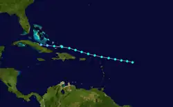 Another short-lived tropical storm was first identified about 195 mi (314 km) east of Guadeloupe by 12:00 UTC on September 9. Data from a reconnaissance aircraft indicated the storm intensified slightly to attain winds of 60 mph (97 km/h) by early the next day,[2] in spite of a poorly defined circulation center.[3] It tracked northwest and then north, passing within 130 mi (210 km) of Bermuda before dissipating around 18:00 UTC on September 12.[2]