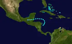A tropical storm formed southeast of the Nicaragua–Honduras border early on August 29 and tracked northeast. After curving north and then west, the cyclone attained peak winds of 70 mph (110 km/h) over the Gulf of Honduras early on August 31. It moved ashore near Belize City, Belize at peak strength, where heavy rainfall and high tides resulted in flooding of 2–3 ft (0.61–0.91 m) within the city.[3] The system weakened quickly once inland, dissipating just northeast of Ocosingo, Chiapas by 18:00 UTC on September 1.[2]