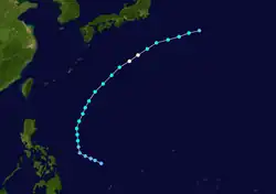 On 30 September the storm was located between the Philippines and Okinawa with winds between 210 and 260 kilometres per hour (130 and 160 mph) and waves up to 30 metres (100 ft).[11] On October 1, a United States Air Force PB4Y-2 aircraft went down during a flight into the typhoon, killing all seven crew members aboard.[12]