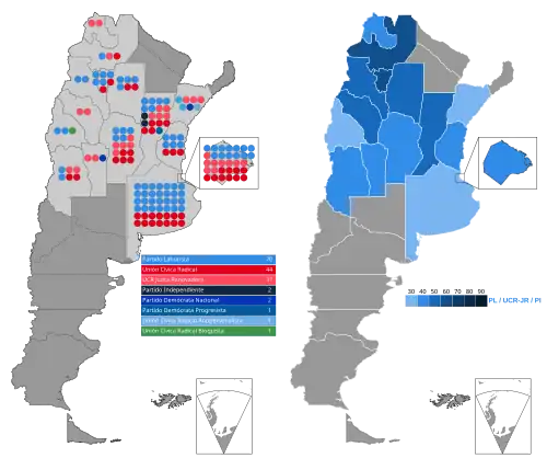 ![]() Most voted party by province (left) and department (right). | ||||||||||||||||||||||||||||||