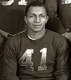 Michigan's starting lineup against Pitt was Ford (left end), Wistert (left tackle), Soboleski (right guard), Dworsky (center), Sickels (right guard), Dendrinos (right tackle), McNeill (right end), Pete Elliott (quarterback), Derricotte (left halfback), Bump Elliott (right halfback), and Kempthorn (fullback).[11]