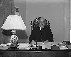 The situation then was that the KVP ministers only wanted to join with the VVD, the VVD only wanted to join with Stikker on Foreign Affairs, and the KVP was unhappy with a PvdA prime minister and disappointed they didn't get Agriculture. On 4 August, the question for the PvdA was whether they were willing to accept Stikker. After intense internal deliberation, the party agreed. On 5 August, the formation was practically complete.[12] The constitutive deliberation on 6 August did not present serious difficulties and mainly discussed replacing Van Mook with Beel.[13] The cabinet was sworn in a day later. On 17 August, Drees delivered the government statement in the House.[14]