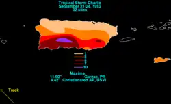 On September 22, a tropical wave moved into the eastern Caribbean Sea,[1] spawning a tropical depression near Hispaniola early on September 24.[4] As it tracked west-northwestward, the low dropped heavy rainfall, peaking at 4.42 in (112 mm) in Christiansted, United States Virgin Islands, as well as 11.9 in (300 mm) in Garzas, Puerto Rico.[15] In Puerto Rico, the rains caused landslides that affected seven towns, notably Ponce, the island's second-largest city.[16] There, at least 14 buildings were destroyed.[17] The floods left more than 1,000 people homeless, 300 of whom took refuge in a Red Cross shelter.[16] Overall, the flooding on the island killed four people and left moderate damage of around $1 million (1952 USD, $11.8 million 2025 USD).[1]
