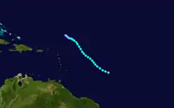 The third tropical cyclone of the season developed on August 31 a short distance east of the northern Lesser Antilles.[4] Its presence was reported by a ship the next day that encountered rough seas and gale-force winds. As a result, the Weather Bureau sent the Hurricane Hunters to investigate the system, which reported a strengthening hurricane moving northwestward.[1] Given the name Baker, the hurricane passed north of the Lesser Antilles, reaching peak winds of 110 mph (175 km/h) late on September 3.[4] For several days, the Hurricane Hunters reported similar winds, along with gusts up to 140 mph (230 km/h).[1]