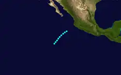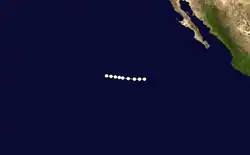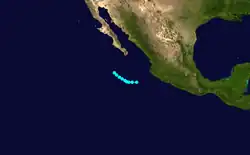 A hurricane developed on September 15 southwest of Baja California and dissipated seven days later.[1] Moisture from Five produced 2 in (51 mm) of rainfall in the deserts and mountains of central and southern California.[2]