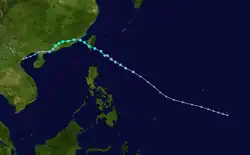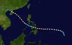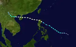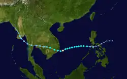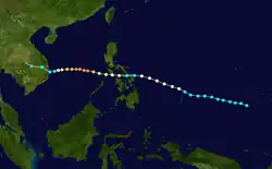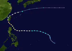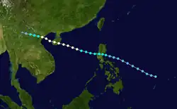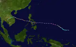 Typhoon Trix formed near Micronesia on October 15, 1965, tracking southwest. It intensified rapidly, becoming a tropical storm on October 16 and a typhoon shortly after. Trix reached peak intensity as a Category 4 super typhoon with winds of 220 km/h (135 mph) and a central pressure of 965 hPa on October 20, while approaching the Philippines. Weakening slightly, Trix made landfall in the Bicol Region on October 21, traversing the central Philippines. It emerged into the South China Sea, briefly re-intensifying to Category 4 strength before weakening again. Trix made final landfall near Quảng Ngãi, Vietnam, as a tropical storm on October 25. The JMA ceased advisories inland, while the JTWC tracked its remnants into Thailand.