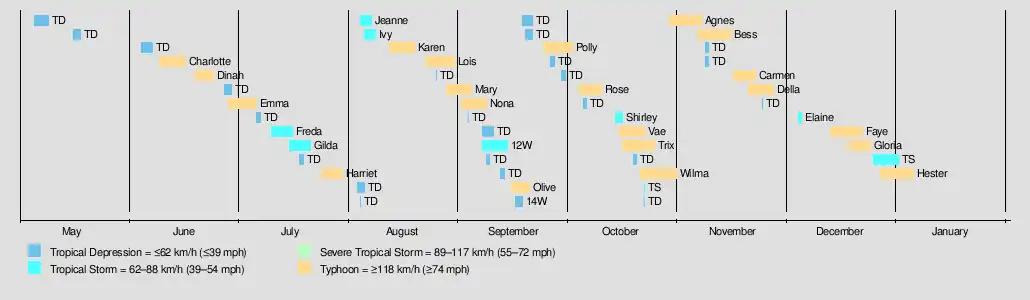 The 1952 Pacific typhoon season had no official bounds, but most tropical cyclones tend to form in the northwestern Pacific Ocean between June and December. These dates conventionally delimit the period of each year when most tropical cyclones form in the northwestern Pacific Ocean.