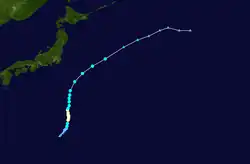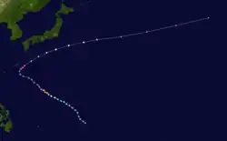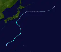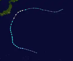 Tropical Storm Olive developed about 1,600 mi (2,600 km) southwest of Honolulu, Hawaii on September 13. The next day, the system intensified into a tropical storm. Rapidly intensifying, Olive became a typhoon on September 15. The next day, Olive strengthened into a Category 5-equivalent cyclone on the modern-day Saffir–Simpson hurricane wind scale. Olive weakened into a Category 2 typhoon before recurving northeast. On September 19, the cyclone weakened further, becoming a severe tropical storm. it then transitioned into an extratropical cyclone and was last monitored on September 21.[2]