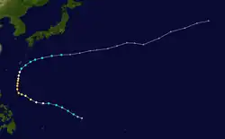 Typhoon Hester formed on December 27, 1952, southeast of Majuro.[3][4] It rapidly intensified, becoming a tropical storm by December 28 and a typhoon the same day. Moving north of the Caroline Islands, Hester underwent rapid intensification, reaching Category 5 super typhoon status with winds of 185 mph (295 km/h) and a central pressure of 905 hPa by December 31, just south of the Mariana Islands.