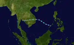 Typhoon Vae originated as a low-pressure area in the western Philippine Sea on October 15. Initially classified as a tropical disturbance, it tracked steadily westward over the next two days, intensifying into a tropical depression by October 17 near the Philippines. Vae reached tropical storm status later that day and intensified into a Category 1 typhoon by October 20, with peak sustained winds of 75 mph (120 km/h) and a minimum central pressure of 975 hPa. The storm maintained this strength while approaching the Vietnamese coast. On October 20, Vae made landfall in southern Vietnam as a tropical storm. After landfall, Vae rapidly weakened and degenerated into a tropical depression by October 21. The remnant system continued westward across Cambodia and Thailand, emerging into the North Indian Ocean near the Andaman Sea before fully dissipating on October 24.