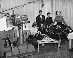 When the usually Democratic-leaning but financially unstable Boston Post planned to endorse Lodge, Joseph Kennedy arranged for a $500,000 loan so the paper would endorse his son; John Kennedy stated that "We had to buy that fucking paper or I'd have been licked."[11] The candidates debated twice. The first was on September 16, when the candidates squared off at South Junior High School in Waltham, Massachusetts before an overflow crowd of more than 1,000. The debate was largely a draw, with one reporter calling it a "gentlemanly tranquil forum." Kennedy and Lodge appeared together in October on national public affairs TV program called Keep Posted, which was broadcast live from New York City and simulcast by a Boston TV station. The topic was "Who will do more for the country, Eisenhower or Stevenson?" To many viewers, Lodge appeared uncomfortable with the medium of TV, whereas Kennedy seemed calm and relaxed.[12][13]