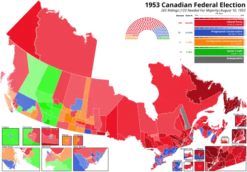 The 1953 Canadian federal election was held on August 10, 1953, to elect members of the House of Commons of Canada of the 22nd Parliament of Canada. Prime Minister Louis St. Laurent led his Liberal Party of Canada to its second consecutive majority government, although the party lost seats to the other parties.